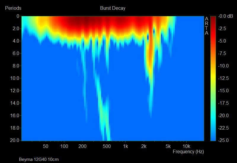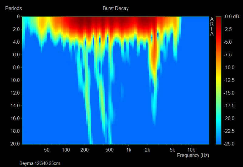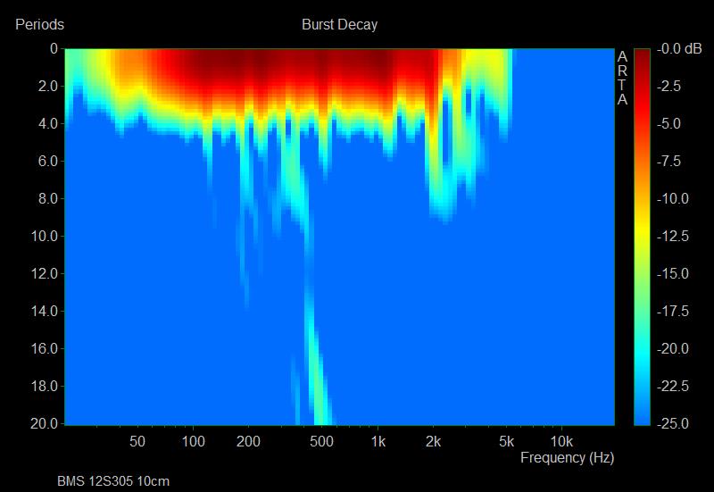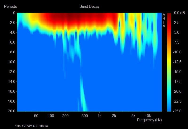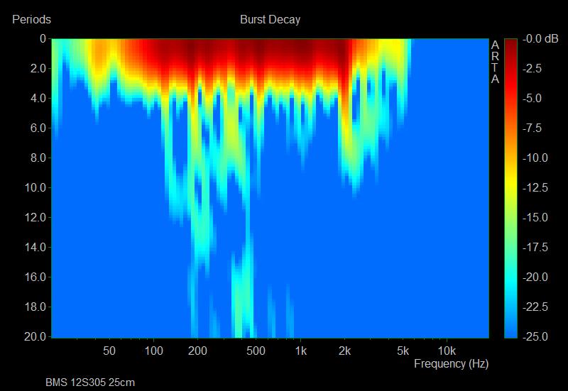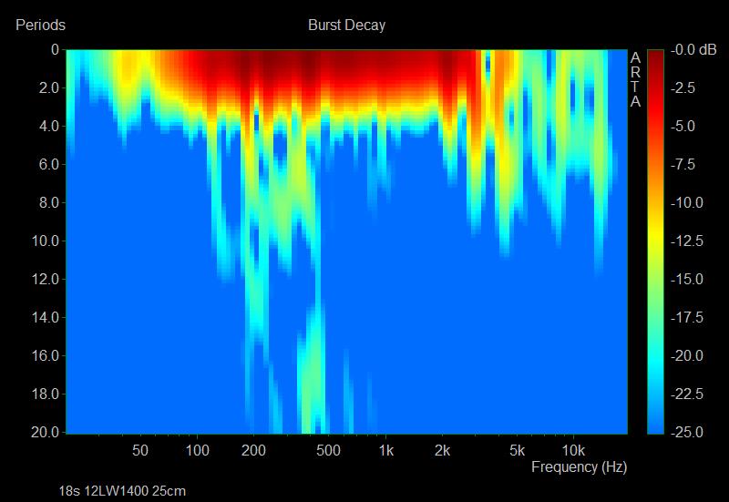 Le CSD est souvent utilisé mais il possède des limites lorsqu’on descend en fréquence. Ici ARTA nous propose une fonction Burst qui ne fait pas une représentation en avec une échelle de temps comme le CSD mais avec un nombre de cycle, ce qui est plus lisible. J’ai également choisis une représentation « sonogram » plutôt que « waterfall » qui est plus lisible sur les fréquences.