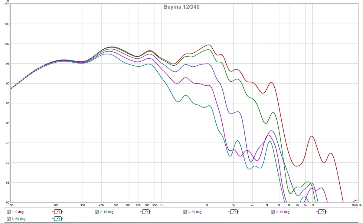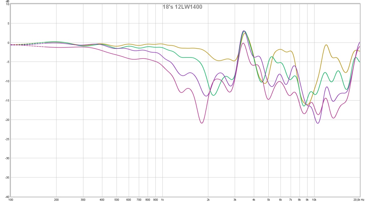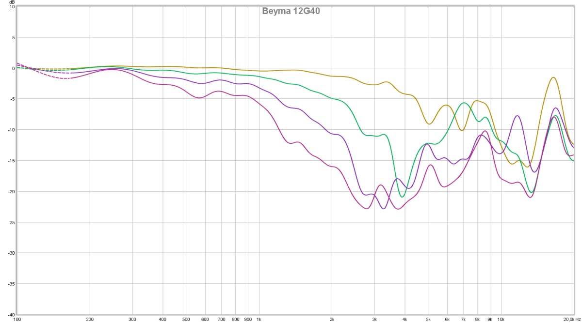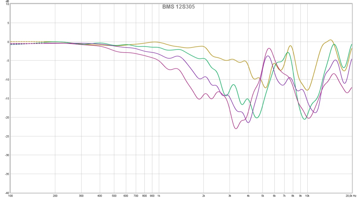 Si on s’intéresse à la fin de bande on remarque que contre toute attente celui qui a la résonance la plus marquée est le Beyma 12G40. Le 18’s est le plus amorti avec plusieurs raies, le fractionnement est donc plus étalé en fréquence. Enfin le BMS parait intermédiaire en terme d’amortissement.