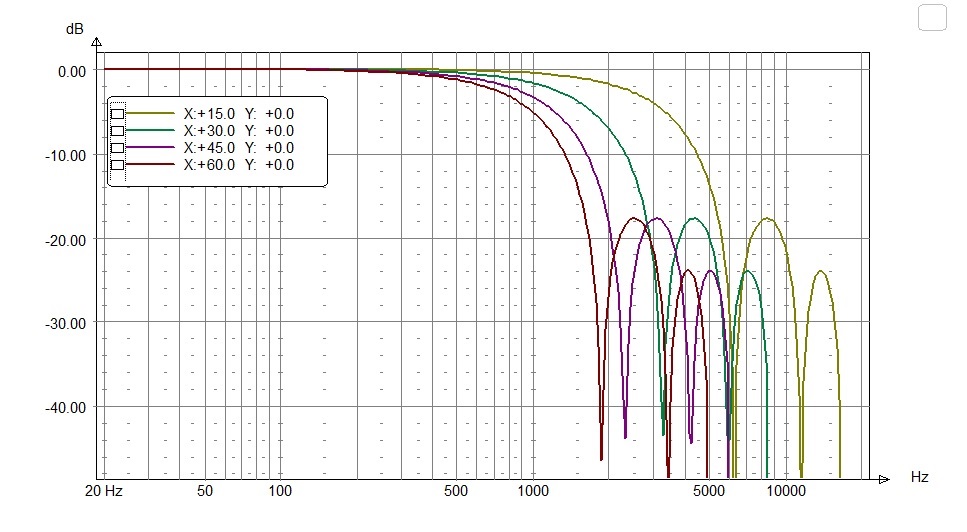 Voyons maintenant les courbes normalisées pour nos trois haut-parleurs à respectivement 15, 30, 45, et 60 degrés.