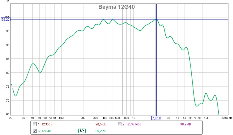 Pas de suprises avec le 12S305 ça se joue à peu de choses et c’est conforme à ce qui est attendu. Le 12LW1400 est celui des trois qui a le moins tourné (20 minutes tout au plus), ce n’est pas si éloigné de ce qui est attendu, on a surtout une sensibilité un peu plus basse, une fois réaligné en SPL ça descendrait même un tout petit peu plus. Le plus gros écart vient avec le Beyma, là on est quand même moins proche.