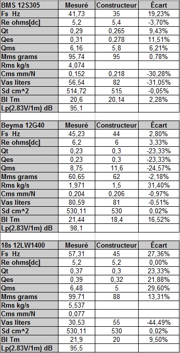 Des valeurs différentes peuvent provenir d’un protocole de mesure différent. Les haut-parleurs sont tous les trois neufs ou presque, mesurés à froid sans pré-conditionnement. Si on les faisait tourner 10 minutes à 20Hz et à fort volume on mesurerait des FS plus basses que celles mesurées ici par exemple.
