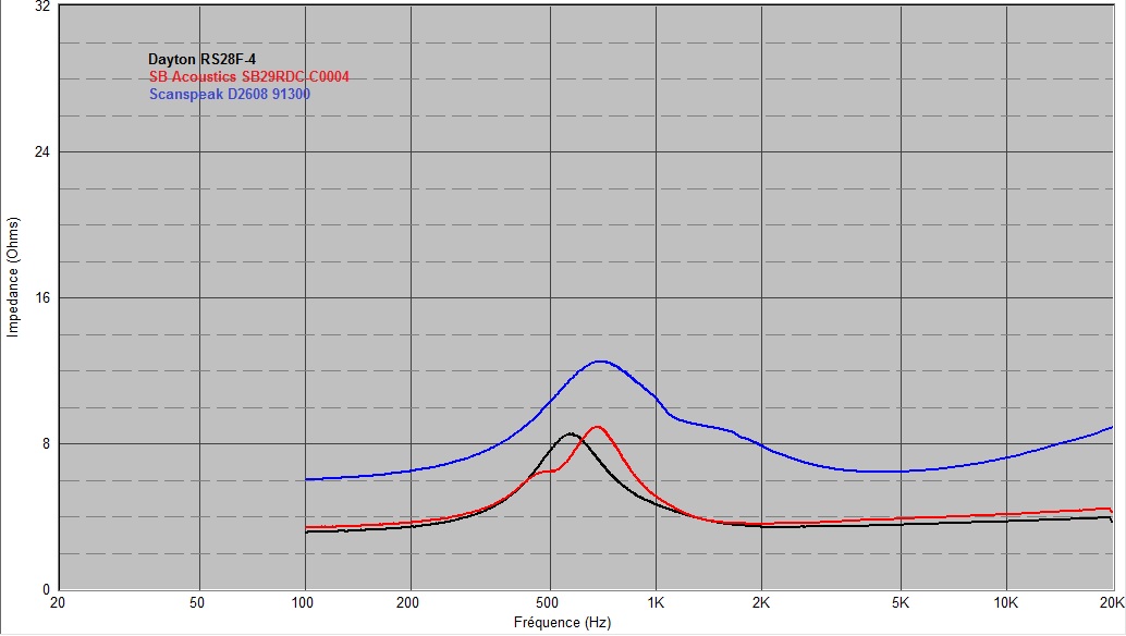 Les fréquences de résonnances respectives sont d’environ : 580Hz pour le RS28, 680Hz pour le SB29, 700Hz pour le 91300.