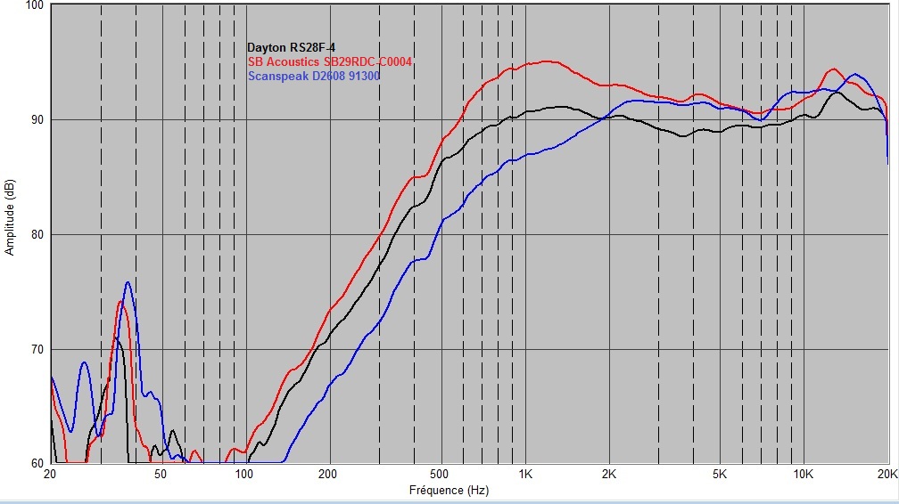 Le SB29 est celui qui possède le plus de rendement et qui descend le plus bas, suivi de près par le dayton le rendement en moins, ils doivent probablement cette extension à leur chambre arrière. Le scanspeak est le moins linéaire des trois avec une remontée dans les hautes fréquences et il coupe plus tôt dans le bas. Il reste néanmoins tout à fait gérable côté filtre.