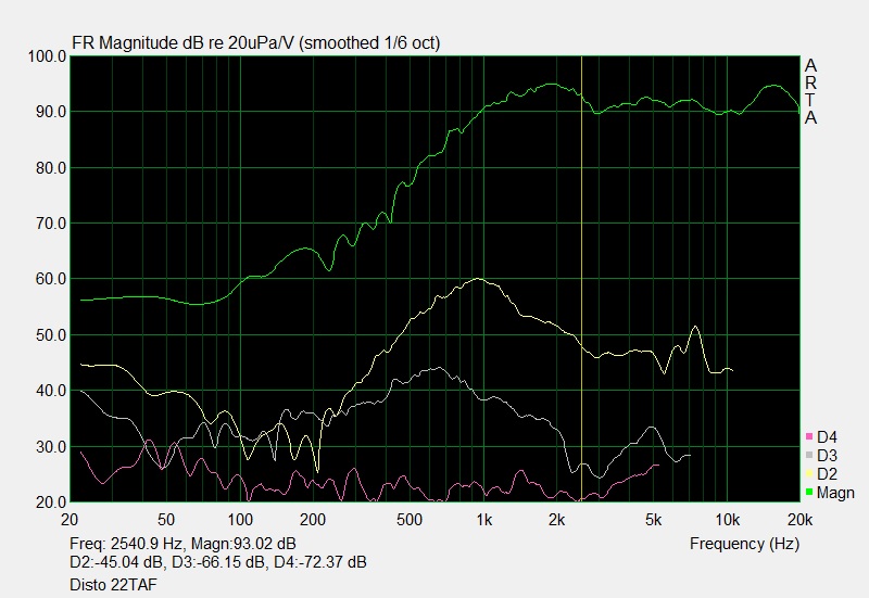 On remarque que ses distos remontent rapidement en dessous de 2,2kHz ce qui indique qu’il ne faudra pas espérer couper ces tweeters beaucoup plus bas.