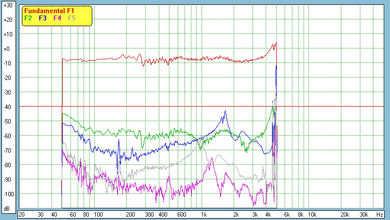 Cette fois toutes les courbes de distorsions harmoniques suivent un profil proche aux mêmes fréquences. Nous ne sommes pas en présence d’une harmonique qui vient exciter une résonance de membrane mais face à une zone de fréquence où les performances globales du tweeter sont très mauvaises.