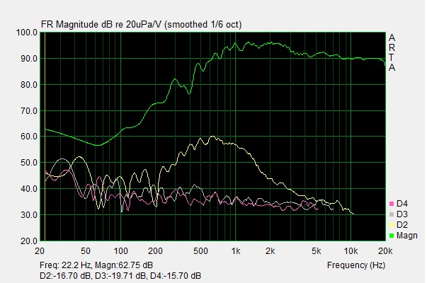 - Votre environnement n’est pas complètement silencieux non plus et il existe un bruit de fond qui sera mesuré par le micro. Là encore ce bruit de fond limitera le niveau le plus bas possible mesuré. Voici l’exemple d’une mesure que j’avais réalisé au début d mes essais sur le même XT25 mais avec des réglages qui n’étaient pas adaptés. Les courbes de H3 et H4 sont confondues entre elles et la H2 les rejoint dans les hautes fréquences.