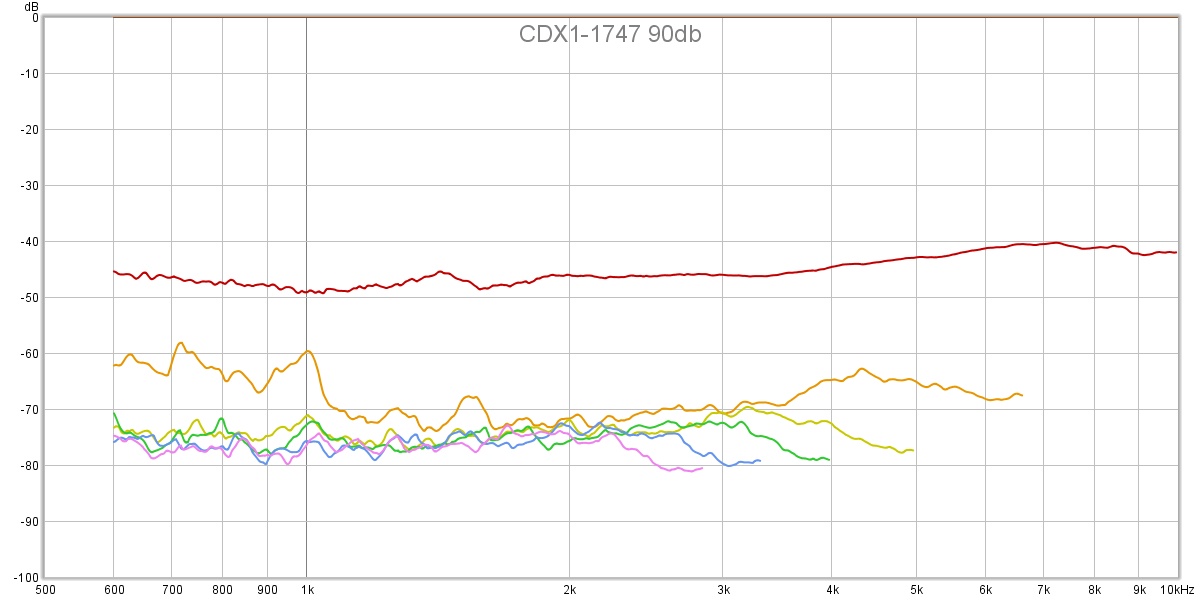 La DE250 reste la plus mauvaise même si dans l’absolu les taux de distorsion ne sont pas ridicules. Petite déception avec la JBL qui voit des remontées d’harmoniques dans les basses fréquences alors que sa petite soeur Selenium domine le débat dans cette partie. On notera l’excellente performance de la RCF ND350.